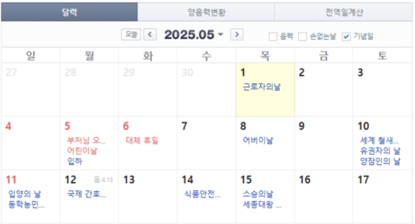 - 5월 5일 (월): 어린이날과 부처님 오신 날이 겹침.