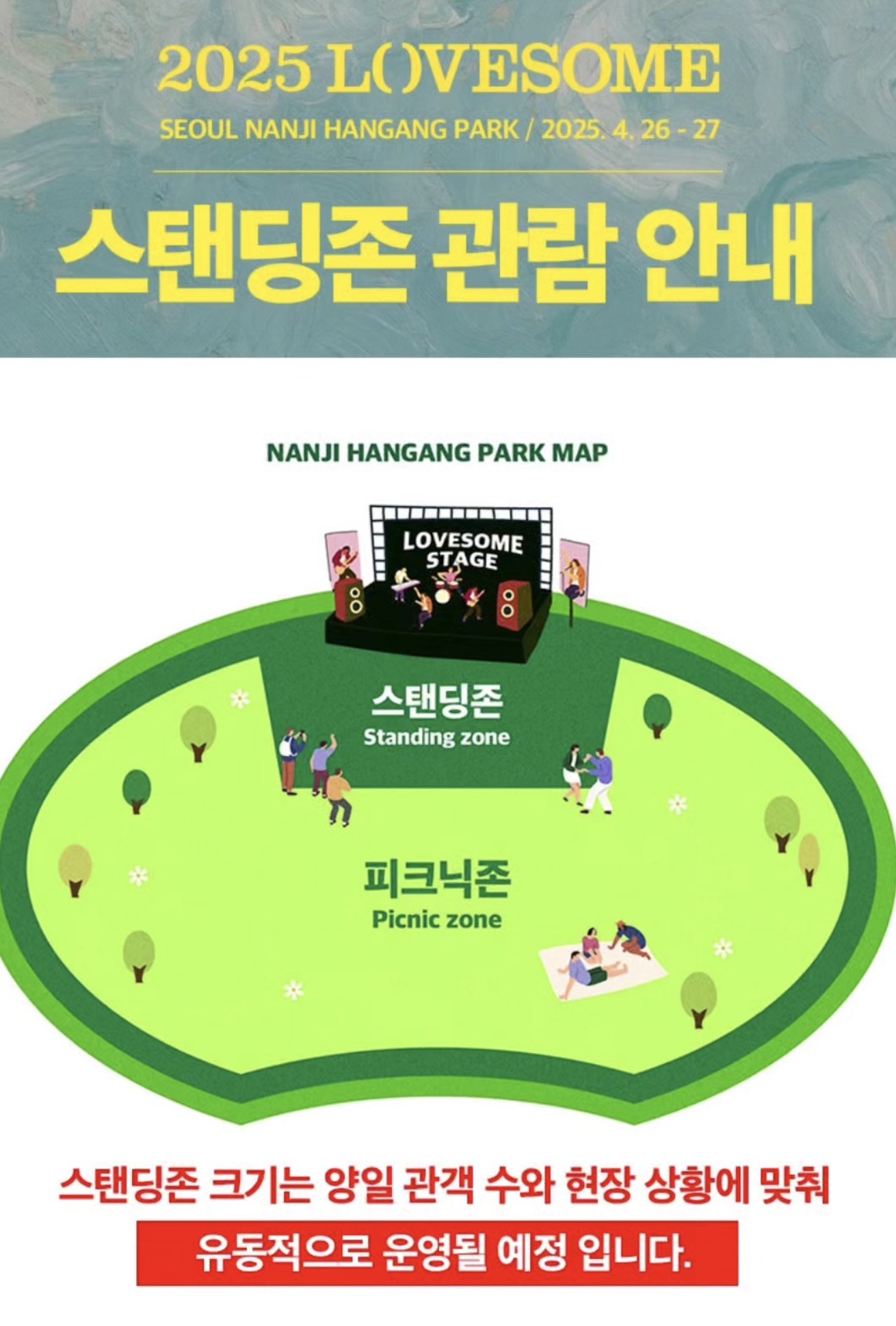- 준비물: 신분증, 티켓, 보조 배터리, 간단한 간식. 돗자리는 LOVESOME 피크닉 존에서 1.2m×1.2m 이내로 제한.